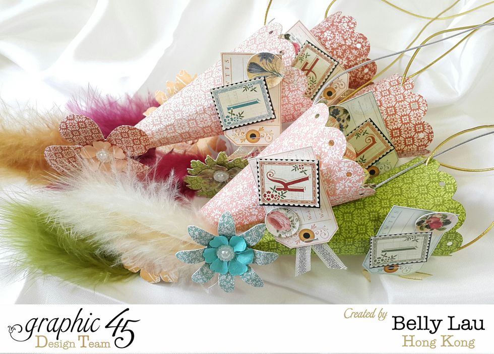 Cut tags from those left behind scrap papers, embellish with Graphic 45 cardstock alphabet stickers and banners