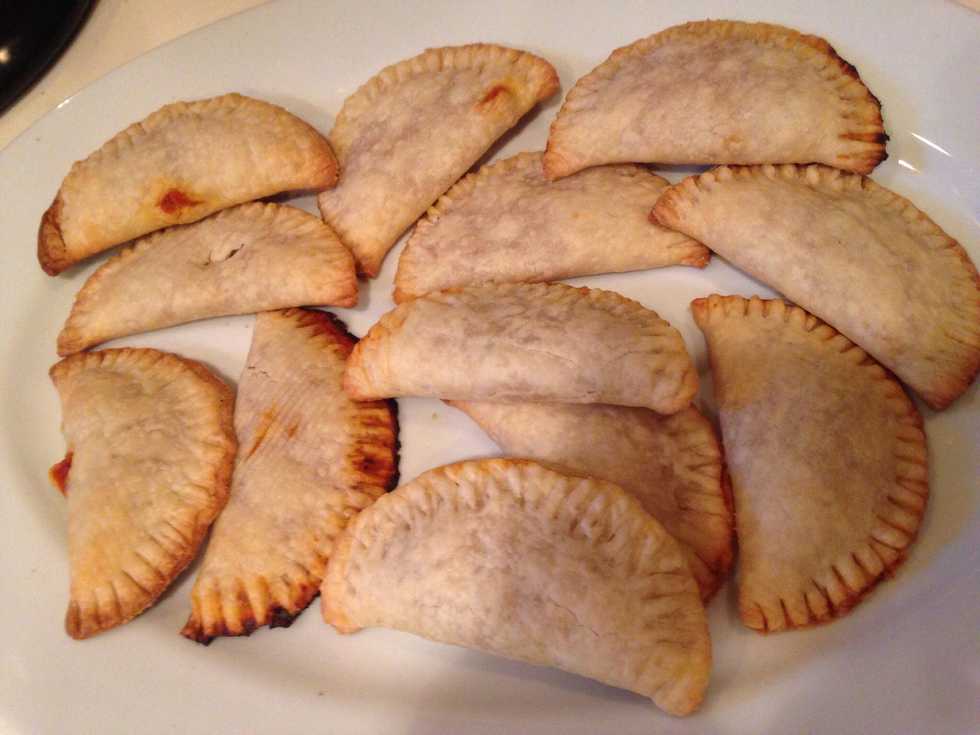 •IMPORTANT: only put a teaspoon full of the mixture in the middle of the crust.• Then brush the edges with no sauce on it with water. Fold it over to make a crescent moon shape and push edges w/ fork.