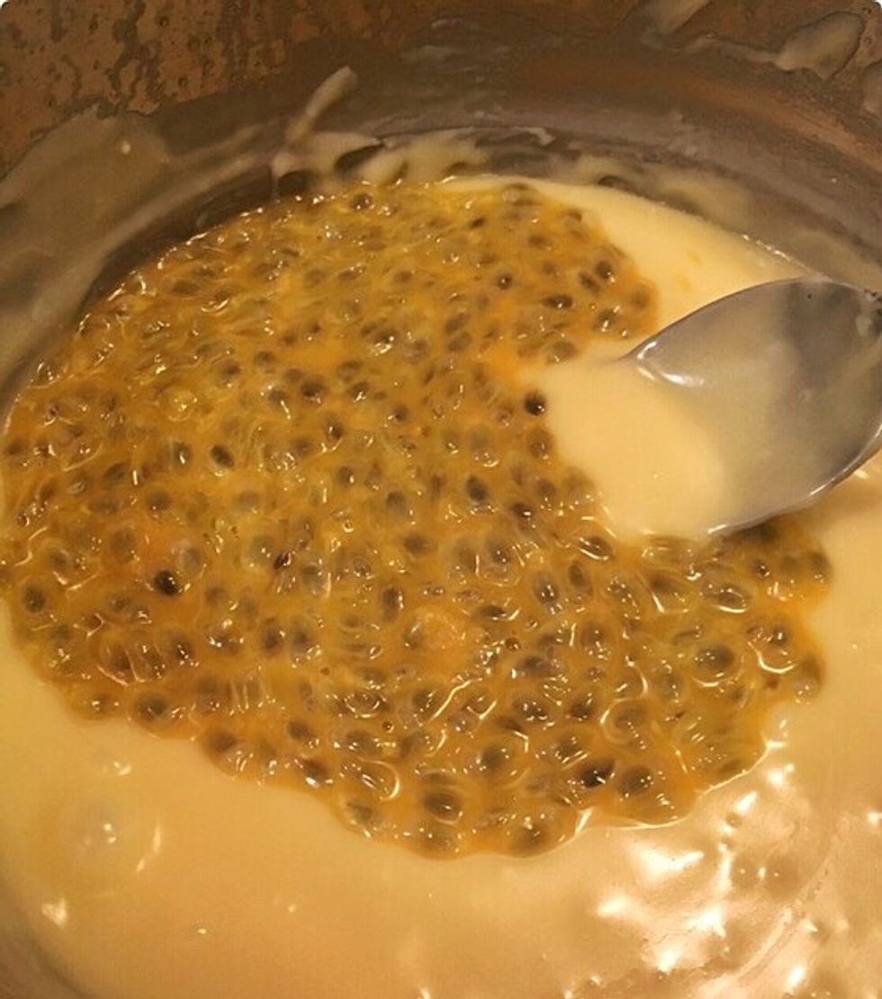 Add the passion fruit seeds. The color gives you a real energy boost!