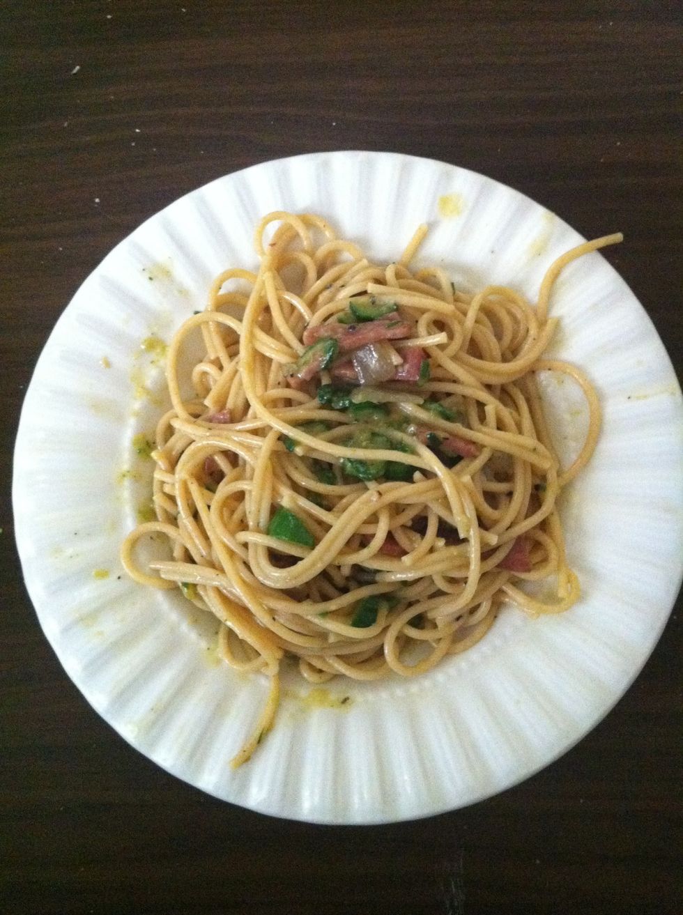 Heat up 2tbs of EV Olive oil in a frying pan, add the chopped scallions and turkey bacon. Let it fry for a minute and then add the zucchini and cook for another 5 minutes. Stir occasionally.