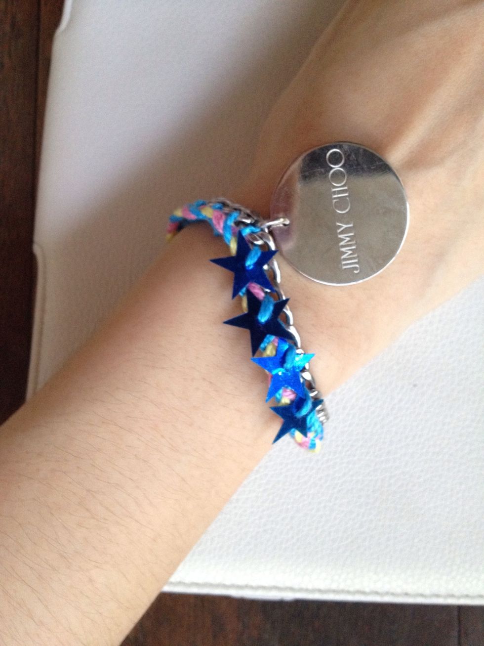 Sewing pastel braid with chain bracelet and sew some star on it wherever u want! Please use one of 3 colors that u braid.