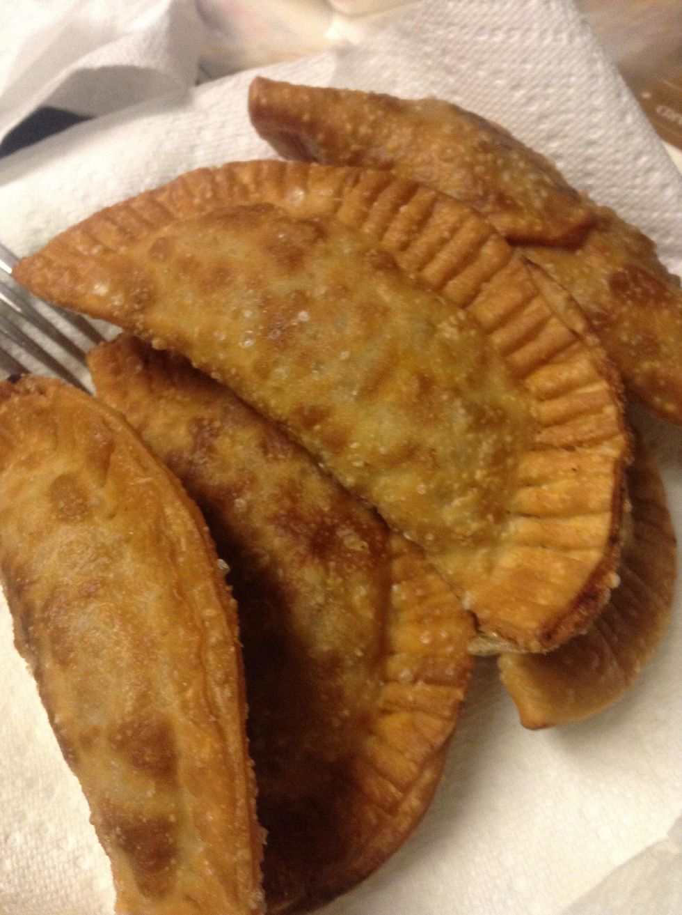 Place pastelillos in oil, frying on each side for a couple of minutes until golden brown. If they brown too quickly lower the heat a little to avoid burning the pastelillos.