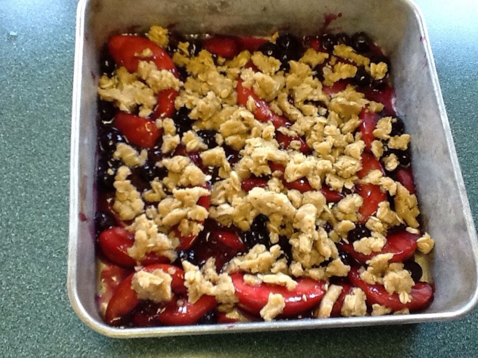 Add fruit mix to lightly greased 8 by 8 baking pan