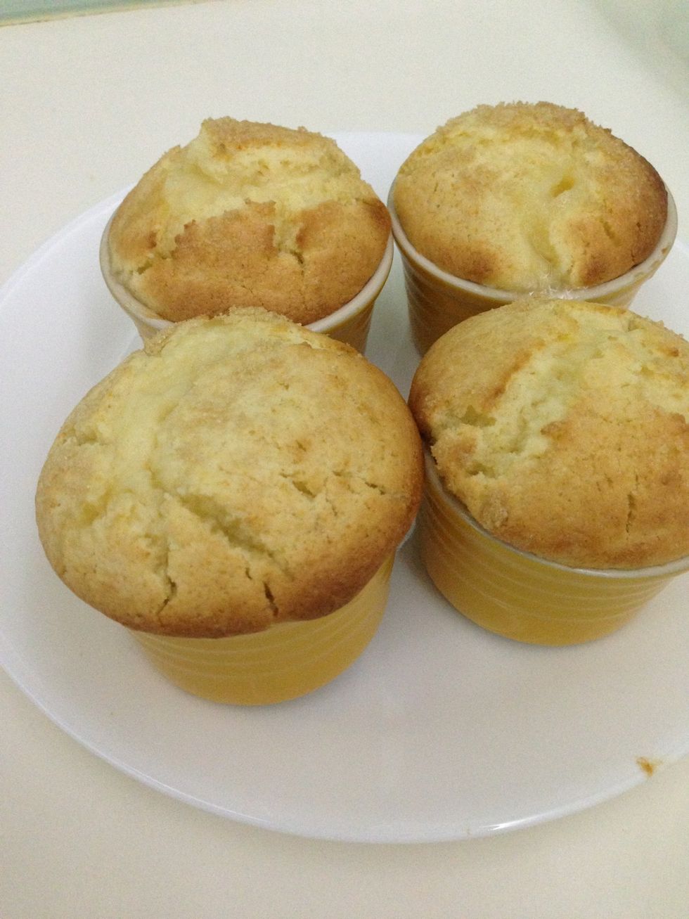 Scoop batter on top of the peaches. Bake at 200C for about 15 mins. Sprinkle some brown sugar on top of each ramekin