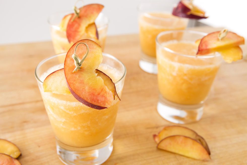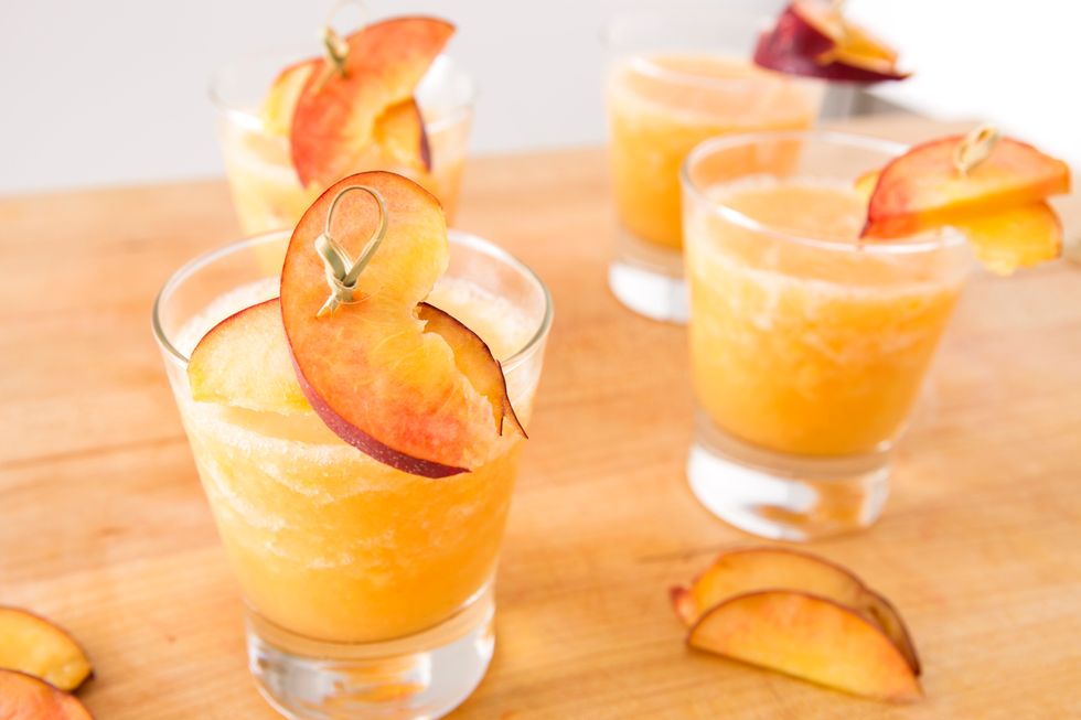 Add your slushie to desired glasses and garnish with fresh peach slices.