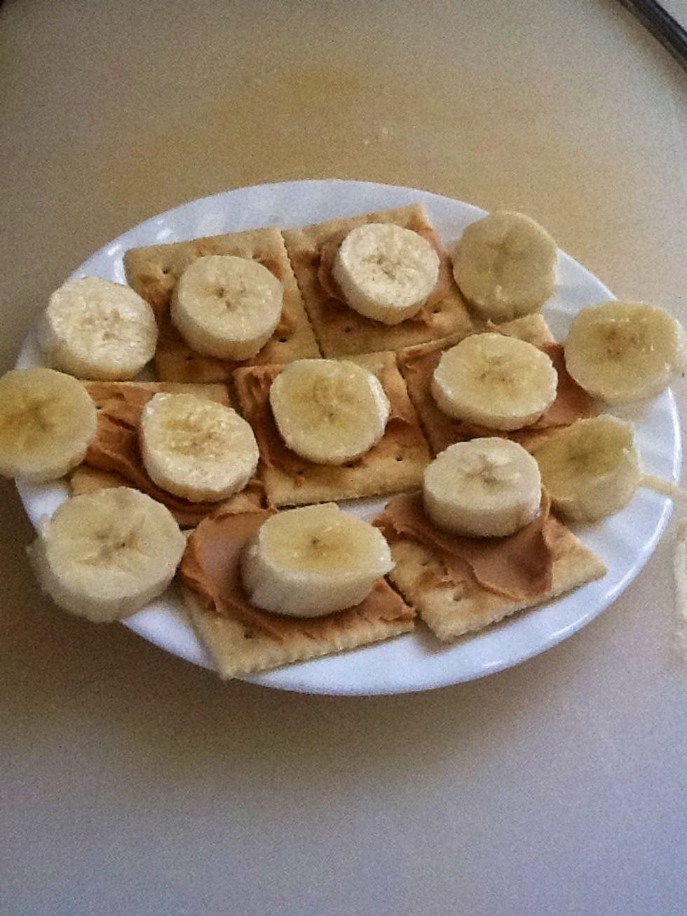 Third add the banana slices on top of the peanut butter and soda crackers.