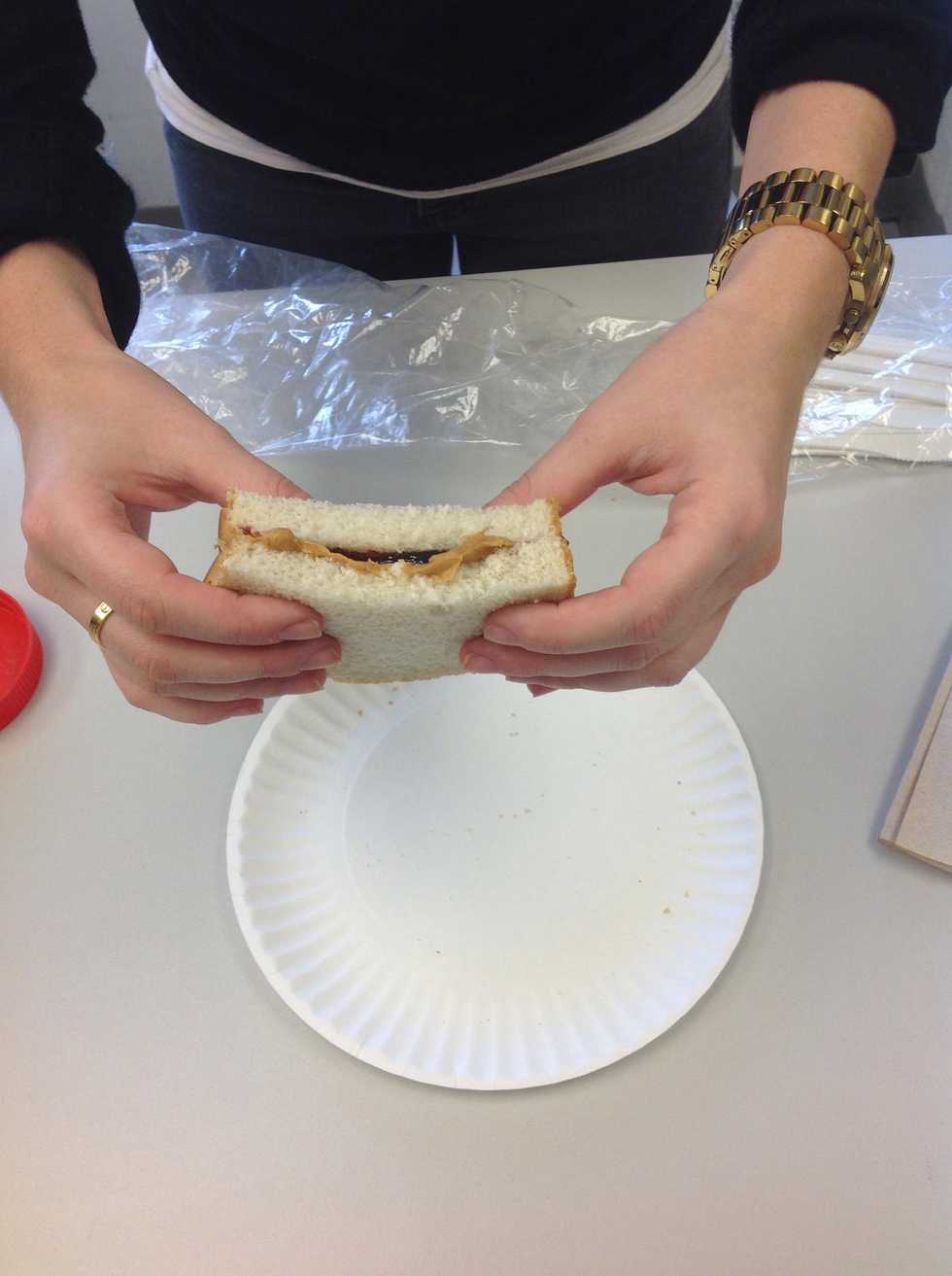 Take 1 piece of breadCut bread in halfSpread peanut butter with knife on 1 halfSpread jelly with knife on other halfPut 2 halves togetherEnjoy!