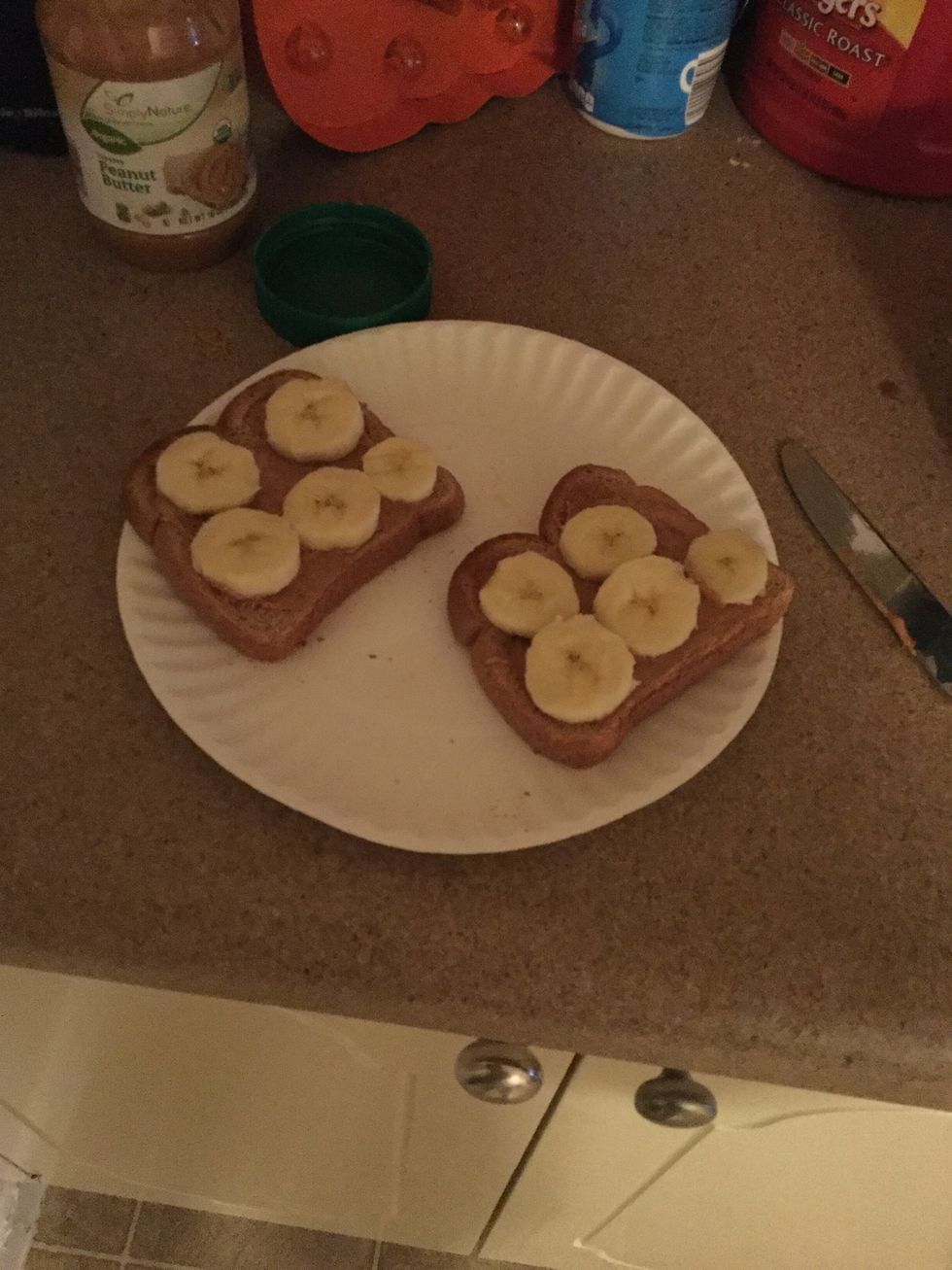 Place slices of banana on peanut butter toast (5 slices per toast). Enjoy!