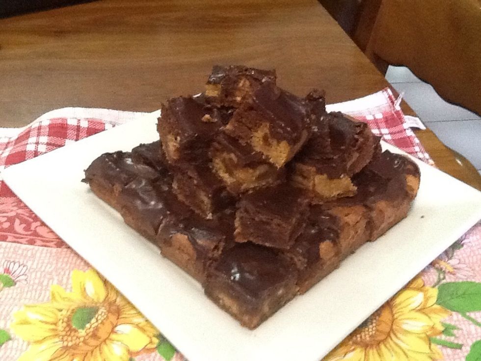 Drop spoonfuls of the peanut butter mixture on top of the partially cooked brownies. Put the tray back into the oven for 25 to 30 minutes, or until the top is light brown.