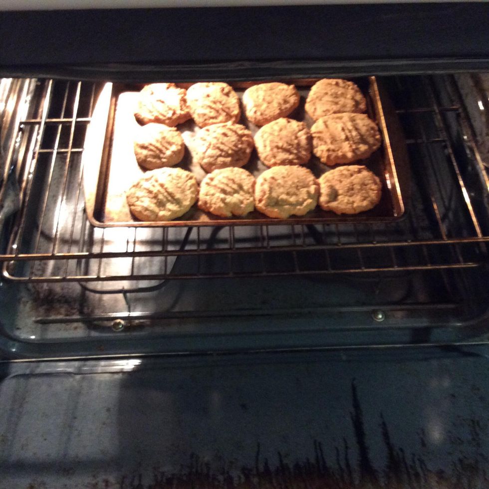 Add one scoop of peant butterAdd the eggAdd 1 cup of sugarMix until well mixedRoll batter into ballsEnd of rolling into ballsPress fork on batterWhen done