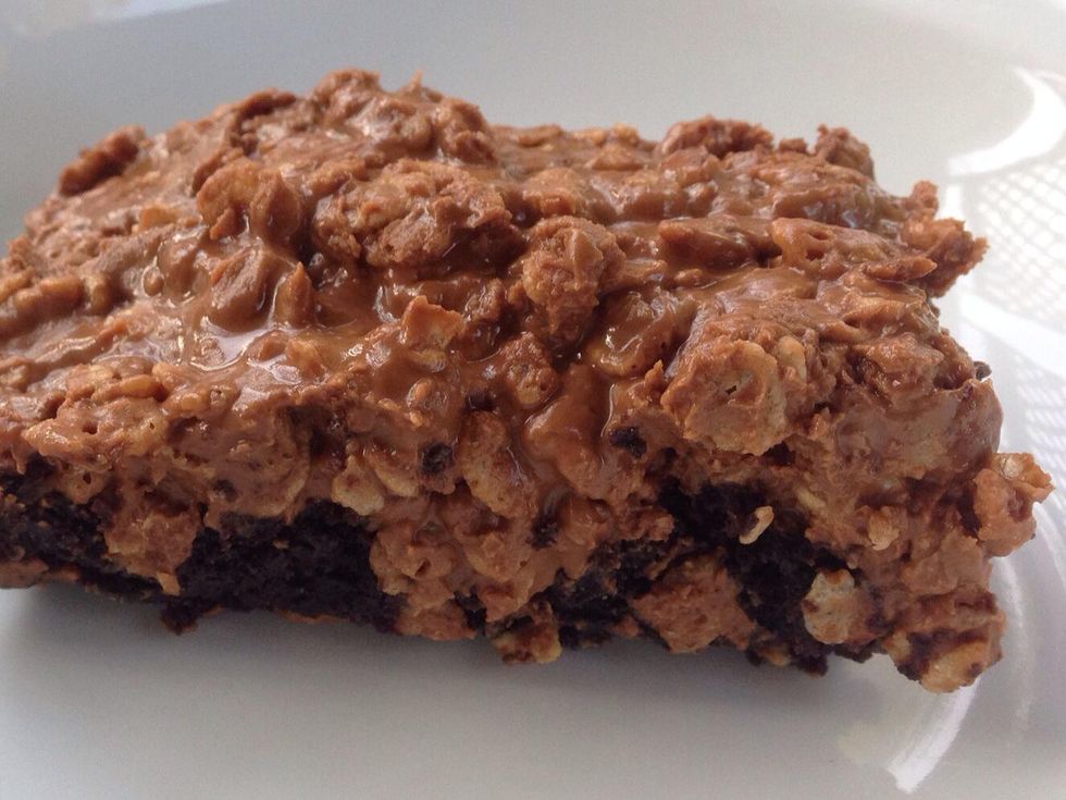 As brownies start cooling, melt 1 and 1/4 cup peanut butter, 3 tbs butter, 11.5 oz bag of chocolate chips in a sauce pan over medium heat. Once melted, stir in 2 cups rice crispies.