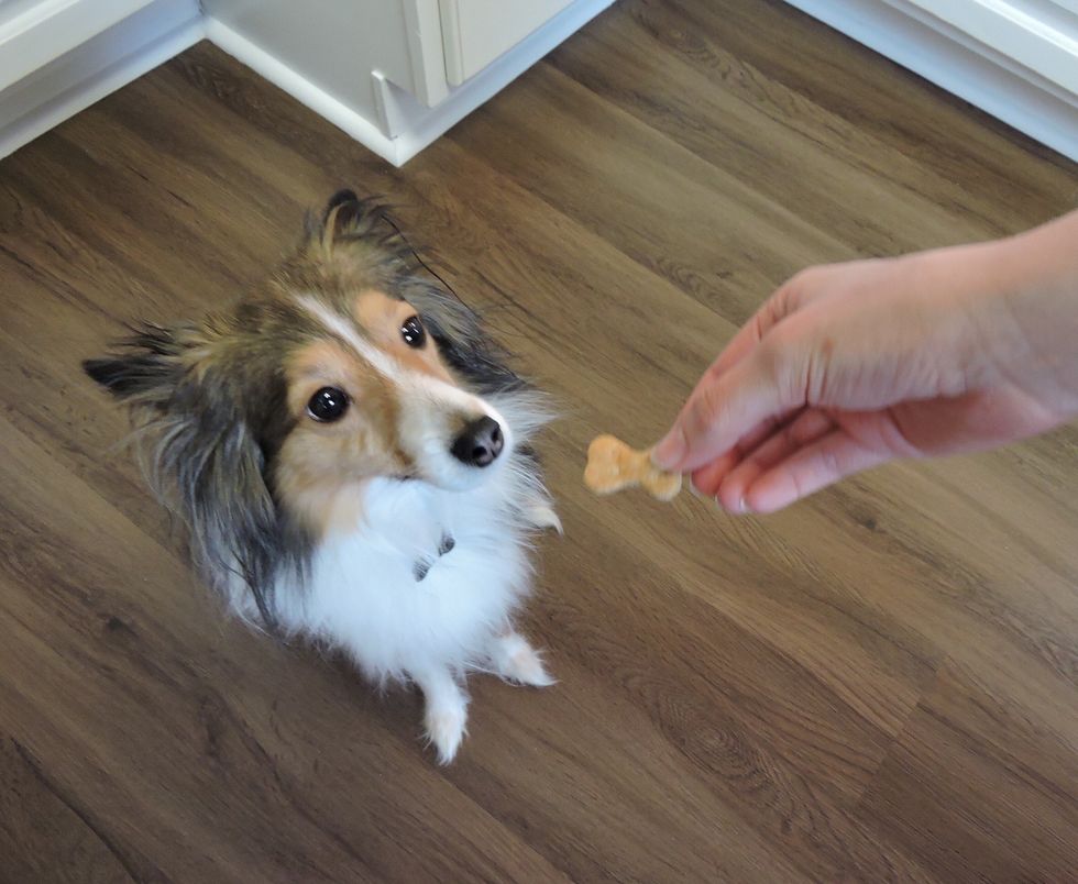 After taking the dog treats out of the oven and letting them cool, give them to your dog to enjoy!