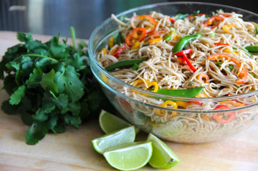 Lightly oil the noodles with canola to keep them from sticking, then pour in the sauce and add the veggies. Mix well and add more of whatever you like. Serve with cilantro and lime wedges. :)