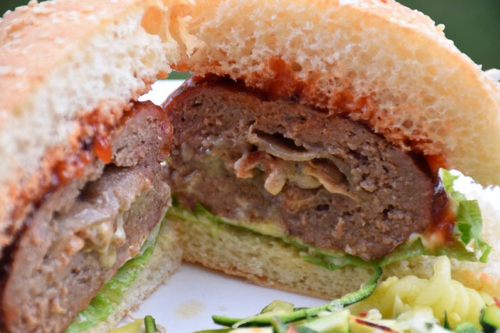 Grill patties 5min on each side until the minimum temperature reads 145F. Let rest 10 min. Dress in your favourite bun. Serve with a zucchini noodle salad. Enjoy!
