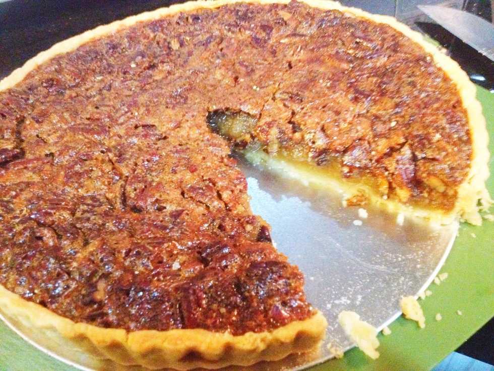 Pour it into the pie crust with the nuts. (Sorry for the horrible photo quality! I was snapping the picture while pouring it myself 😔)