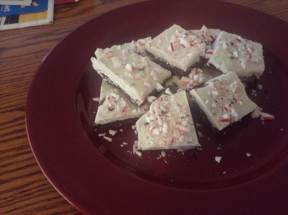 Sprinkle the rest of the candy cane dust on top of the white chocolate. Do this quickly after distributing the chocolate, the dust won't stick if you wait too long.