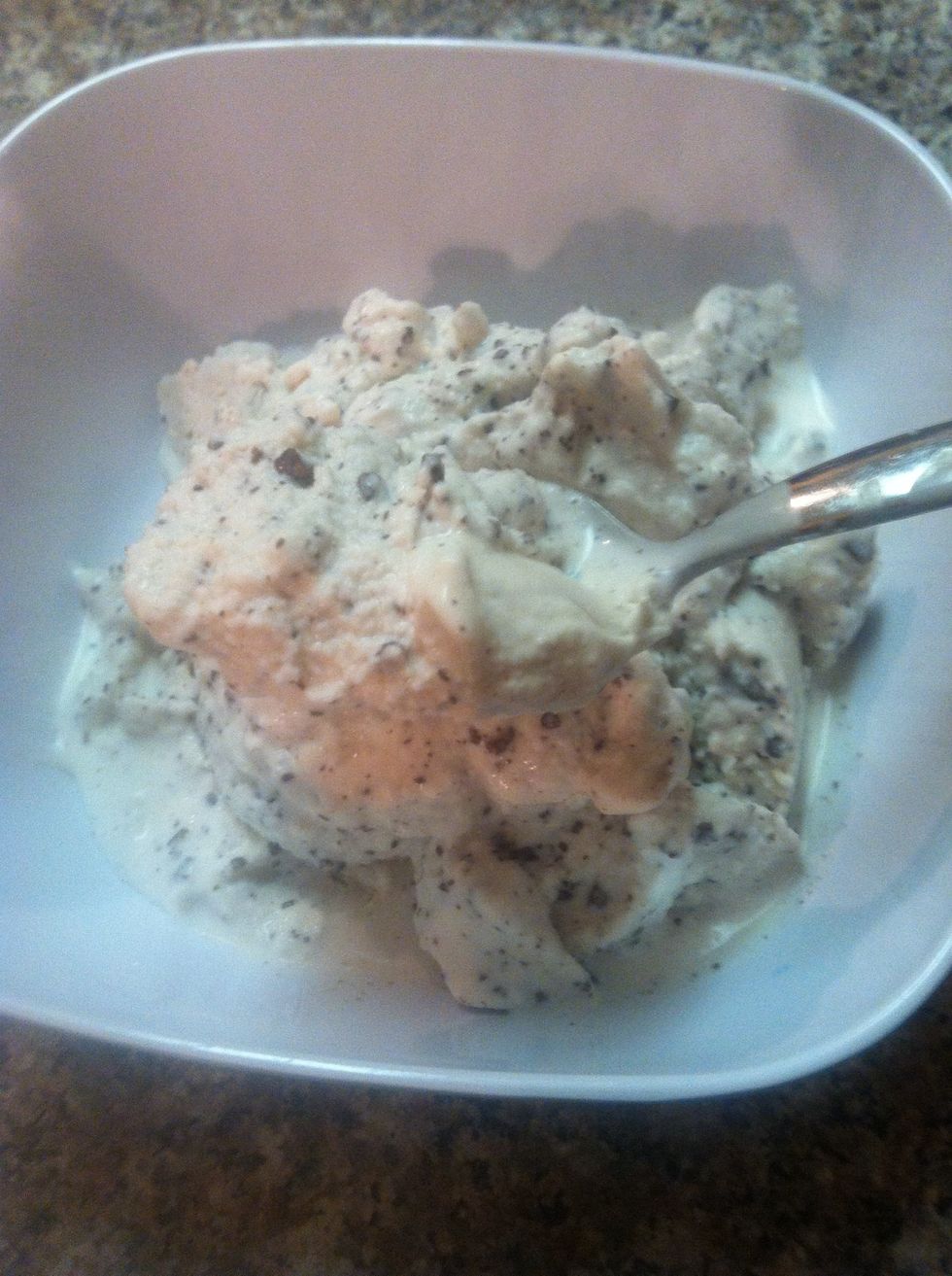 Once your ice-cream starts to thicken you will want to sprinkle your chocolate into your running ice-cream machine. This way the chocolate is mixed in evenly. And Eat it :)