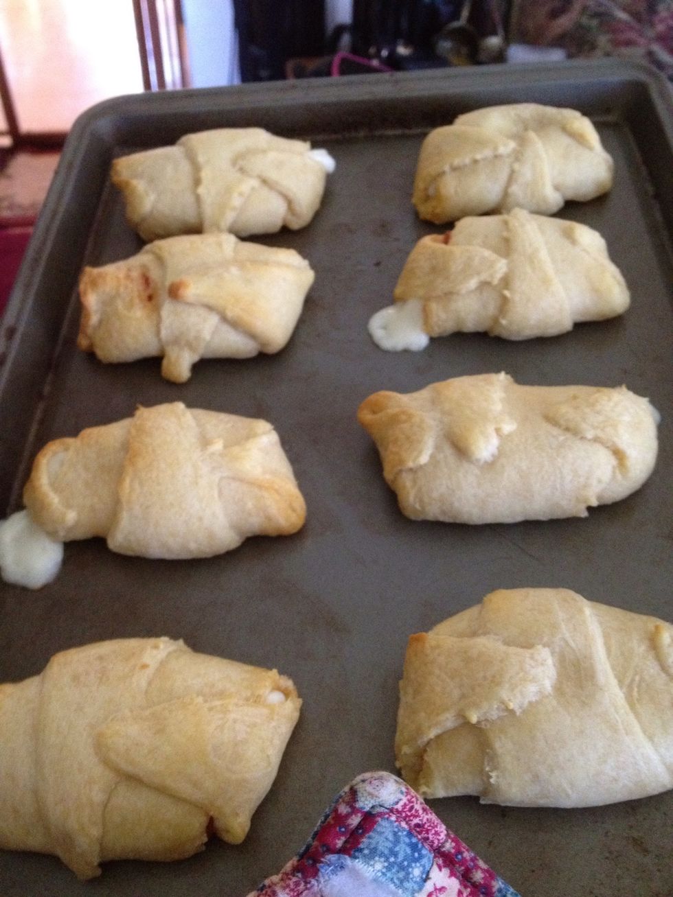 Roll up the cheese and pepperoni in the crescent roll and make sure to fold up the corners so the cheese doesn't come out. Bake in the oven at 350 for 10 minutes or until golden brown.