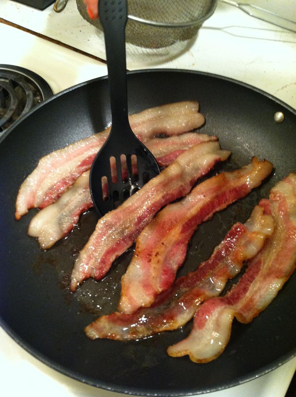 Now, flip the bacon again. This is what it should look like on the other side. Note: One piece of bacon was sacrificed at this step to some beloved housepets.