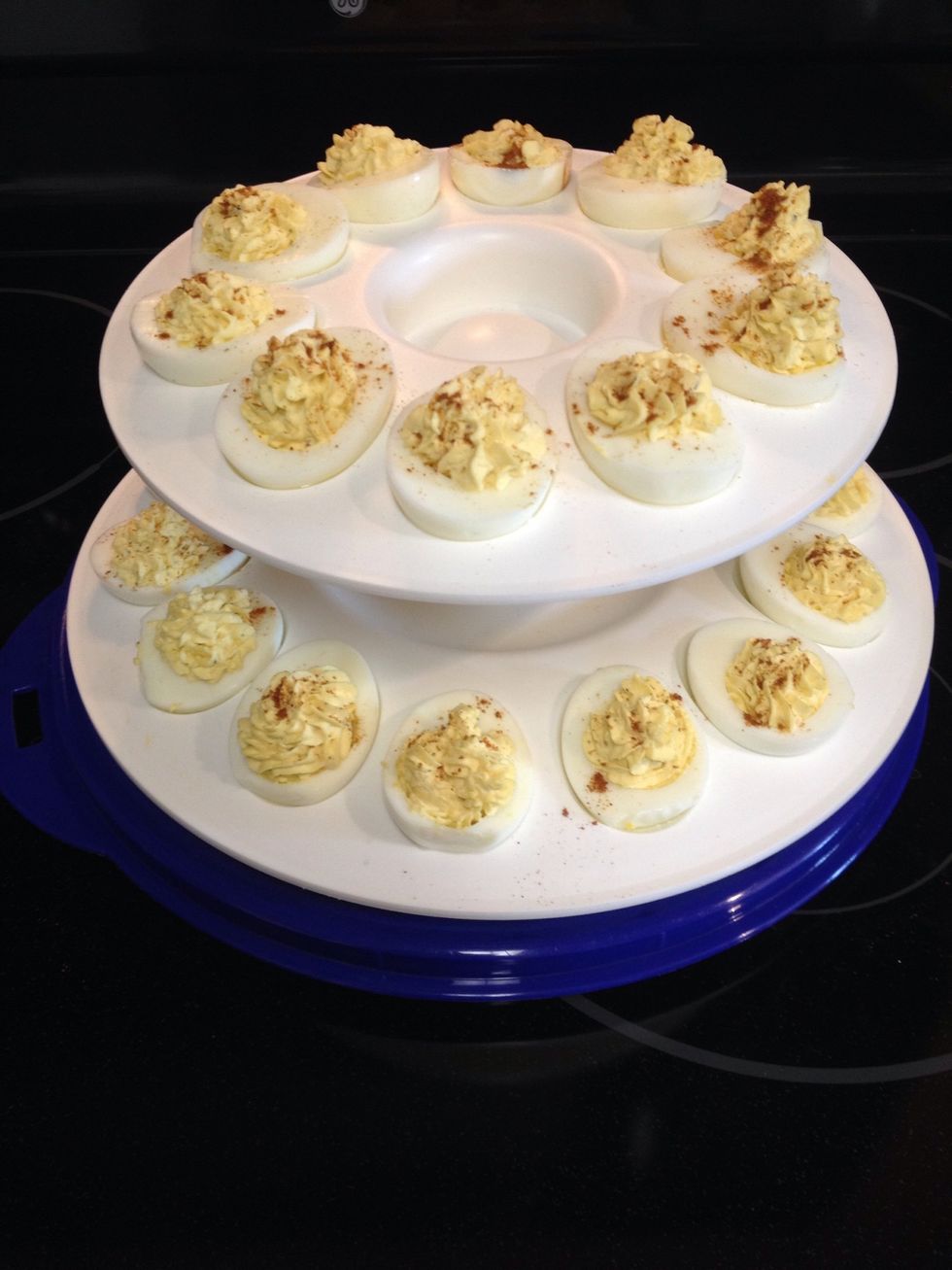 Here, you see I have my egg halves in my carrier, my egg yolks in my bowl (ready to be deviled), and my egg extras. 😊