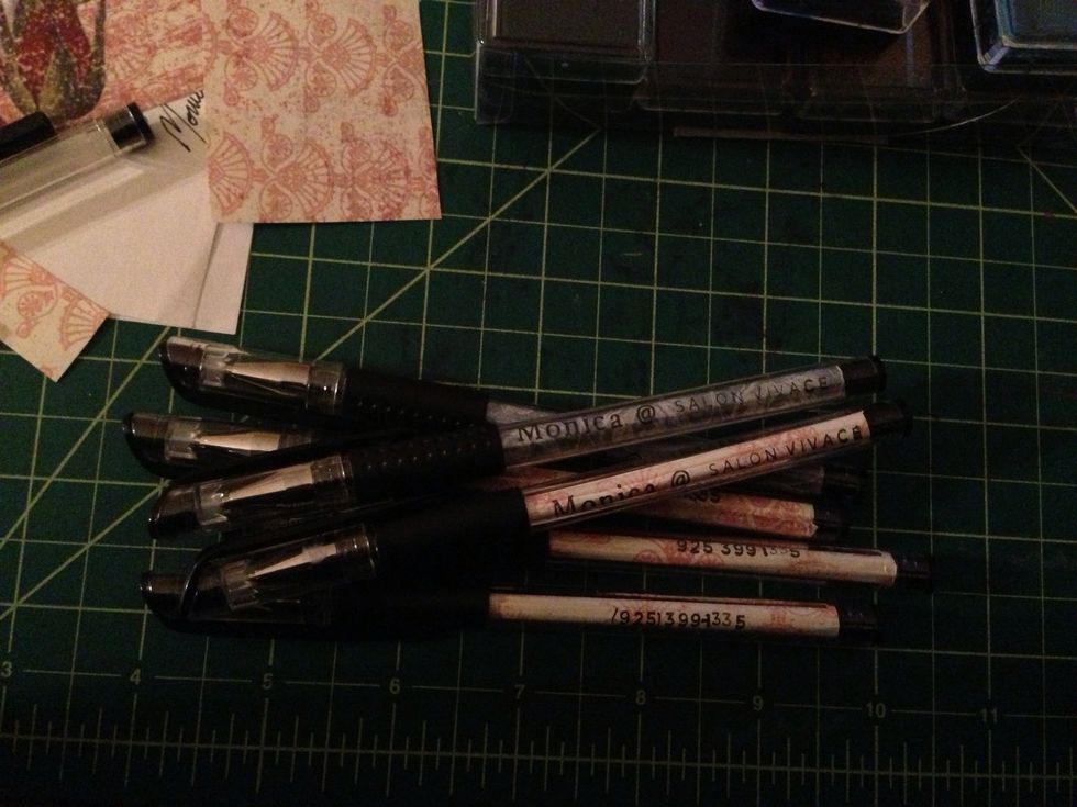 Stamp or print on decorative paper of your choice. The thinner the paper the easier it will be to roll and put inside the pen. Cut to fit clear area of pen. My strips are 3in. by 1in.