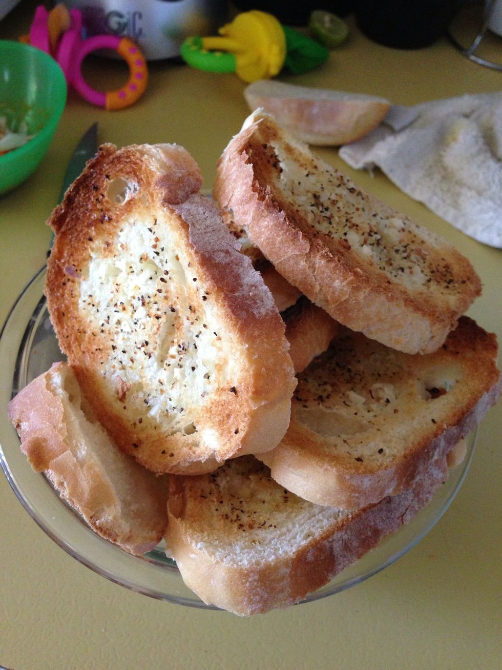 Slice your bread loaf and rub garlic into each bread slice.