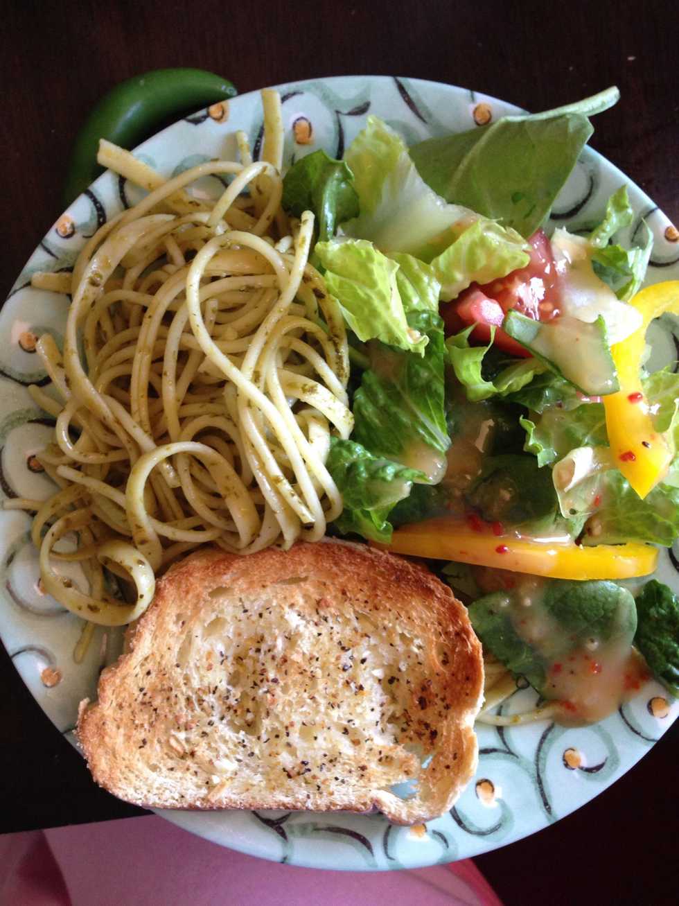 Pesto sauce: blend basil, pistachios, olive oil, salt&pepper, and 3 garlic cloves. Add a little bit of water if sauce becomes too thick to blend. You can also use pine nuts.