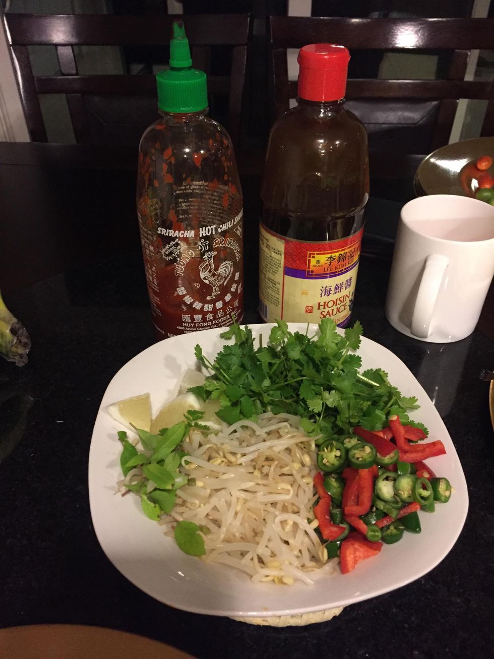 Add Garnishes: bean sprouts, basil, lime juice and sauces: hoisin sauce and sriracha.