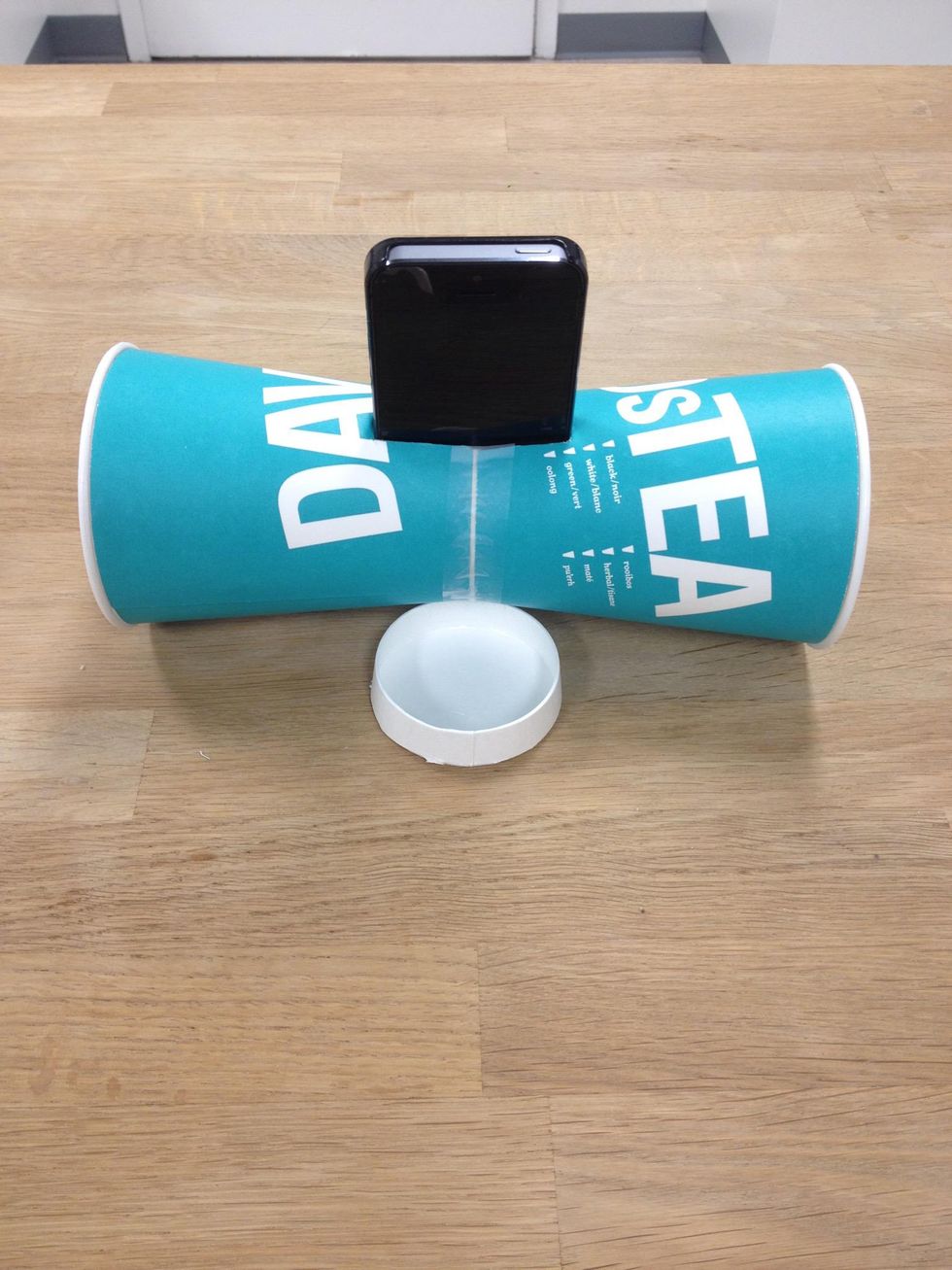 Put on your favourite song and slip you phone into the speakers, using the bottom of cup one as a support.