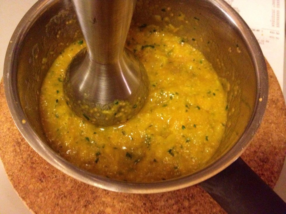 Use your hand blender. Add cumin and salt to taste.