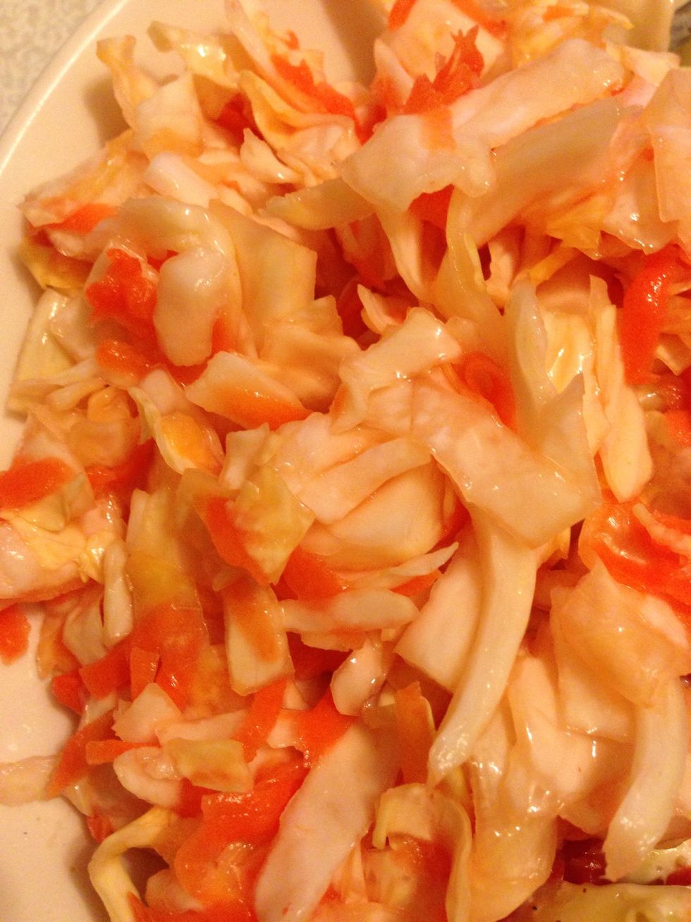 Grate the carrots, and add to the cabbage with all mentioned supplies. Sugar is optional - it just gives a better crunch to the cabbage, but it will be also good without sugar.