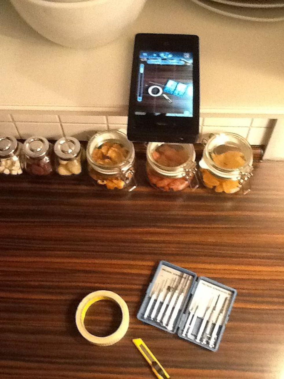 Put your iPhone in an open upper kitchen compartment and adjust to match framing