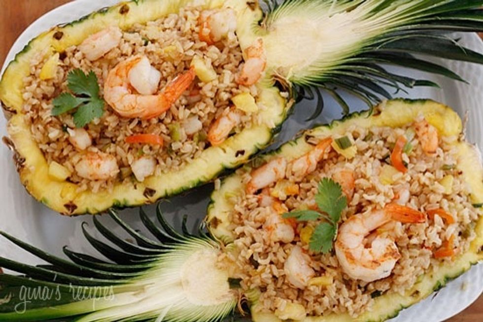 Place in hollowed out pineapple cut in half lengthwise. Garnish with cilantro.