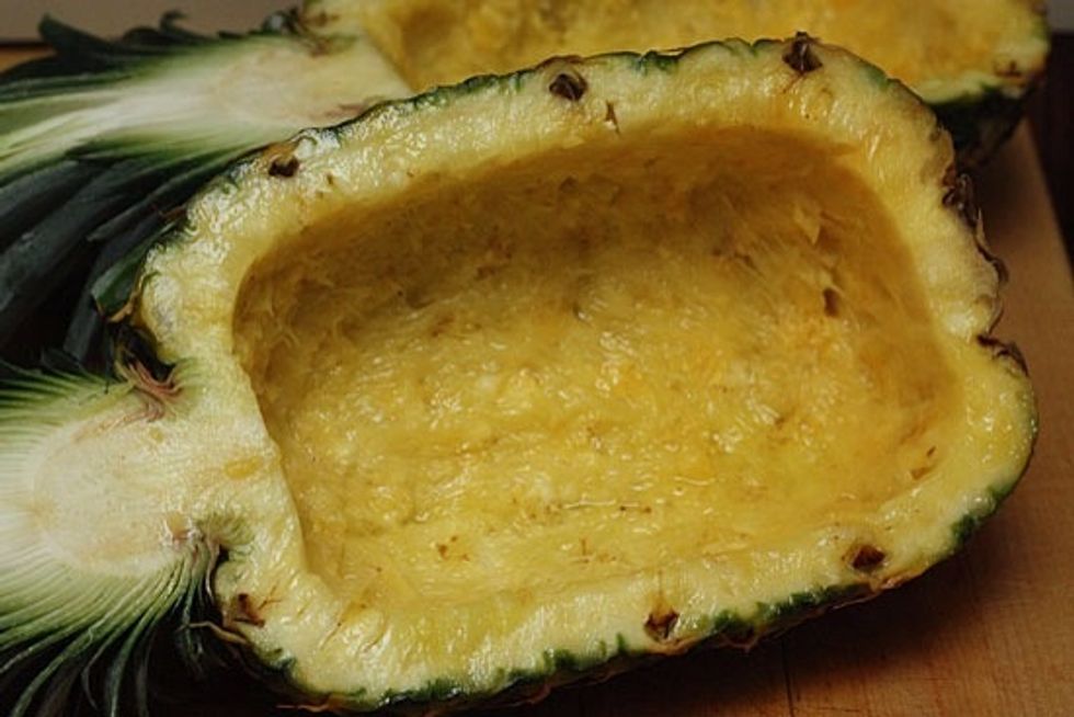Cut a pineapple in half and hollow out both halves to make two bowls.