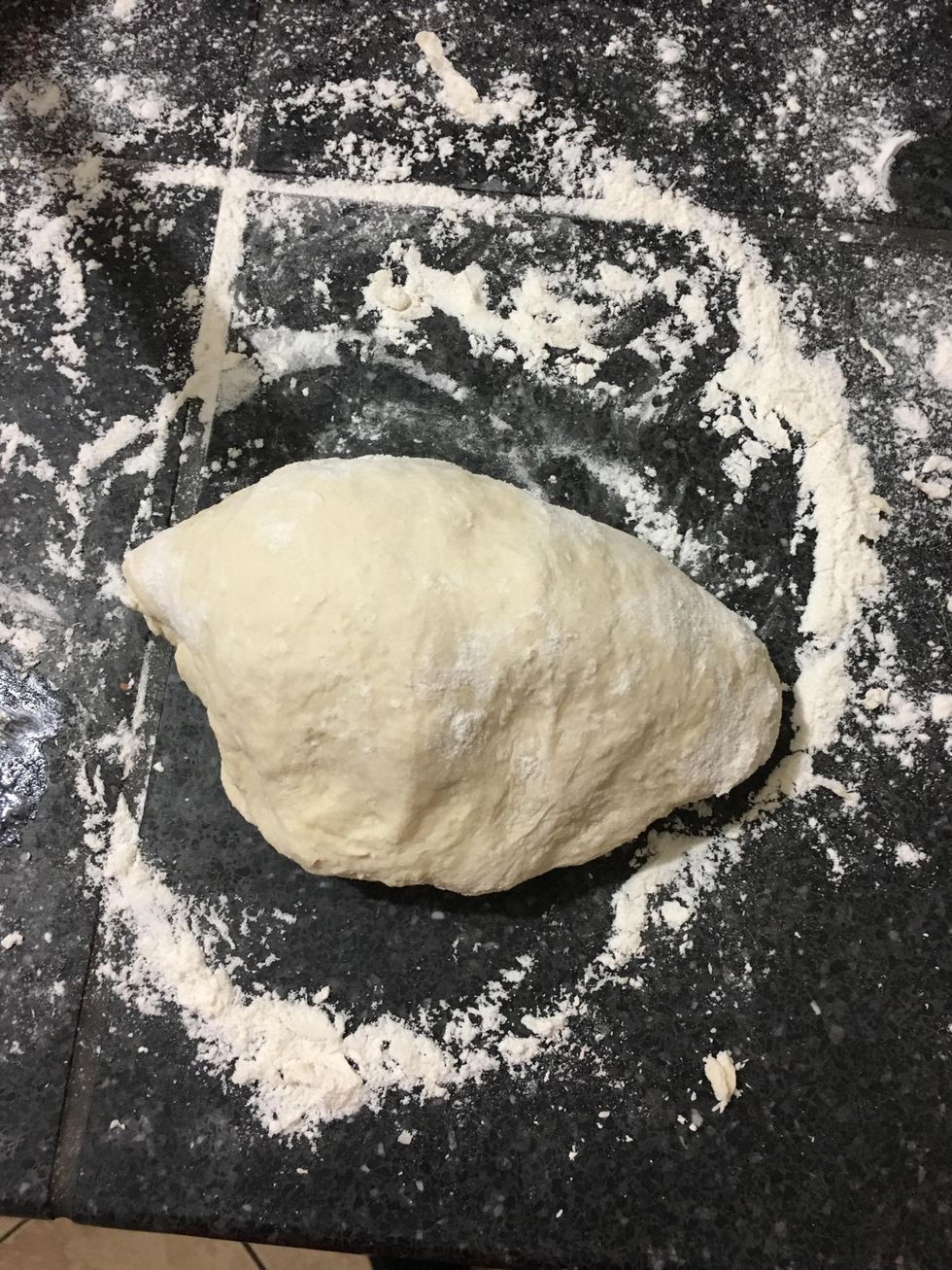 When ball add to lightly floured surface and begin kneading. The water creates gluten in the flour and the kneading strengthens the gluten fibers.