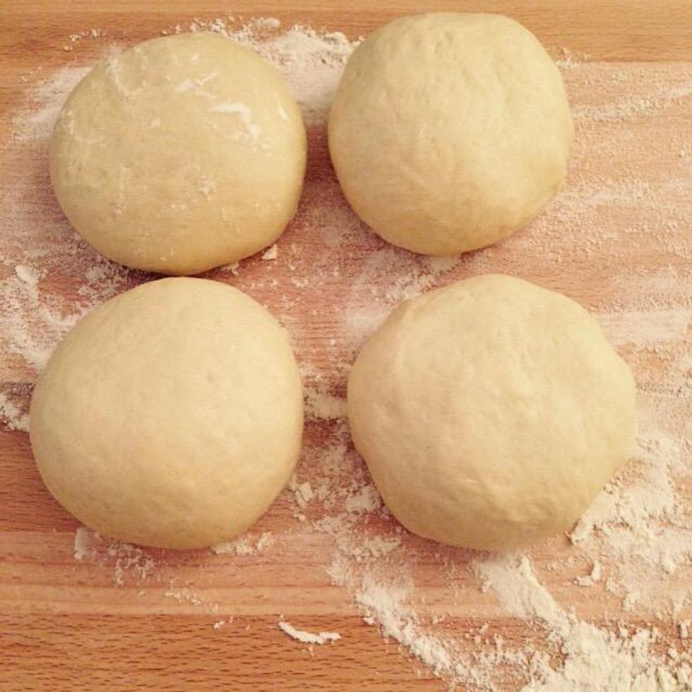 Take the dough out of the bowl and briefly knead it into smaller balls. One ball should weight about 200g for a 32cm thin crust pizza. Make your balls accordingly to the desired shape and thickness.