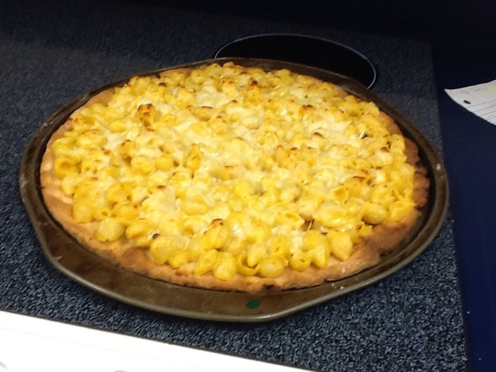 Put Mac n cheese on crust and sprinkle Mozzarella on top