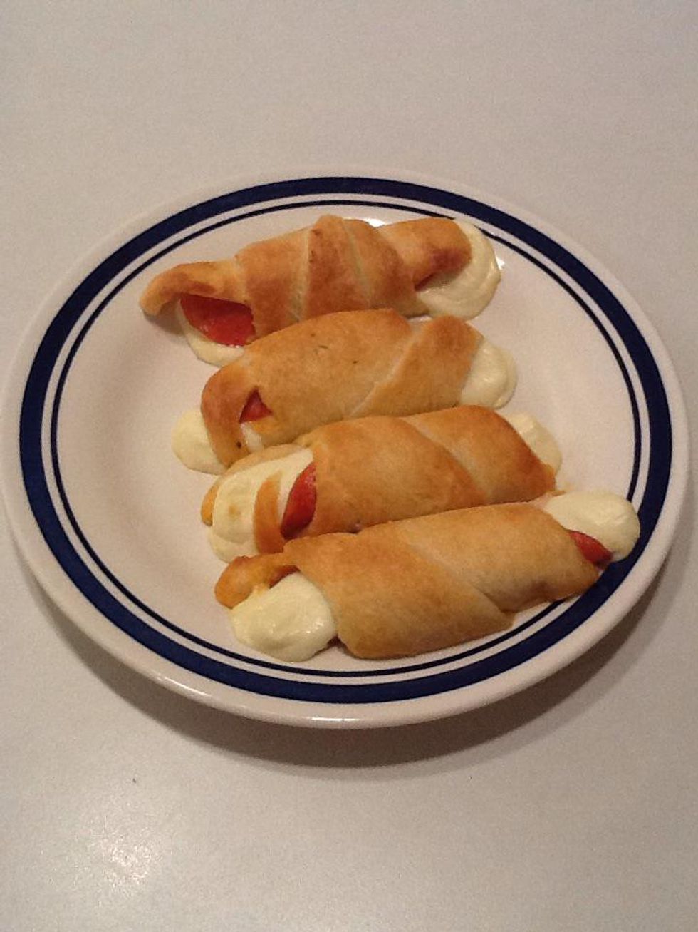 Open container of crescent rolls and unroll each crescent. Lay 3 slices of pepperoni and one string cheese along the largest edge. Roll up and place with end part down.