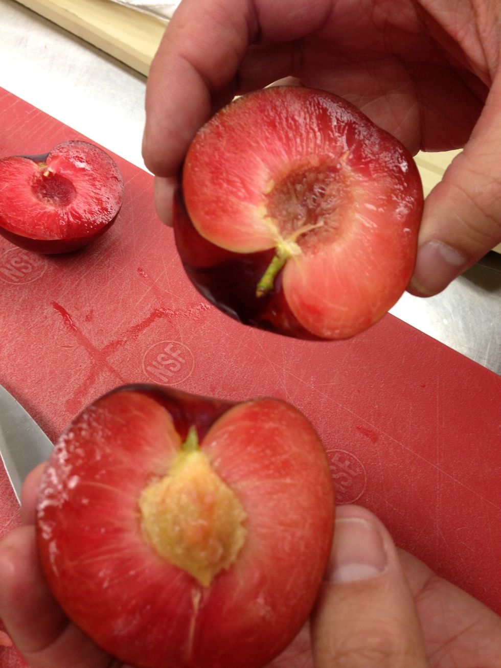 First things first. Let's cut our plumbs. Here's how I do it. With a small knife, cut down to the pit. Keeping the knife in the plum, roll the plum so the knife cuts a circle around the plum.