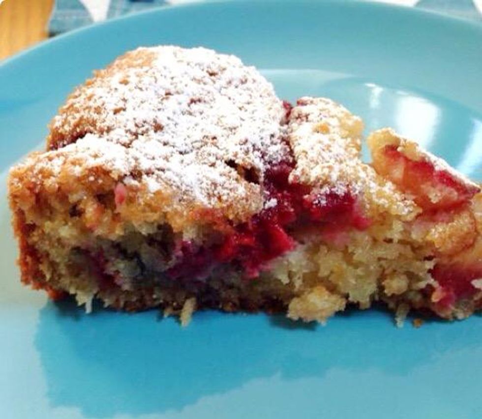 The shredded coconut makes the cake very chewy, in a good way 😀 Next time I will try the combination rhubarb and raspberries or blueberries and..well what do you think??