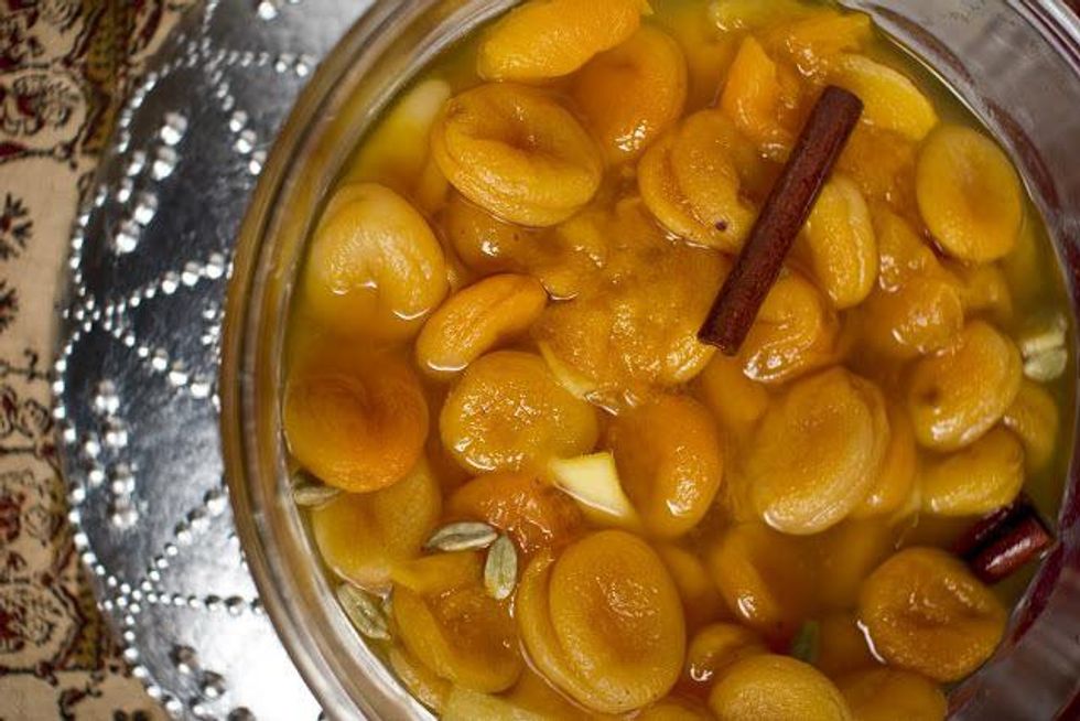 Soak the apricots in 3 cups of water in a large saucepan or handi for 4 hrs or until they puff up Add in : 3 Tbs of sugar One 1/2 inch piece of thinly sliced ginger,4 cardamom pods, 1 cinnamon stick