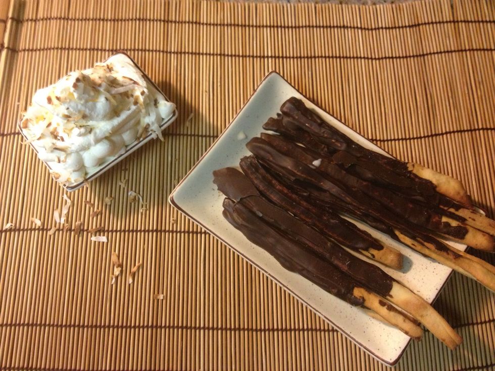 I put the chocolate on a plate to make it easier to smear around and would dip several In at a time. Make sure to leave one end free of chocolate to act as the hand hold