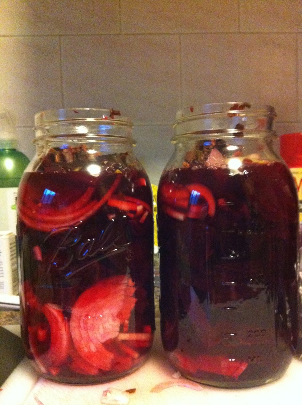 Add pickled beet juice to beets and onions. Get all those spices in!