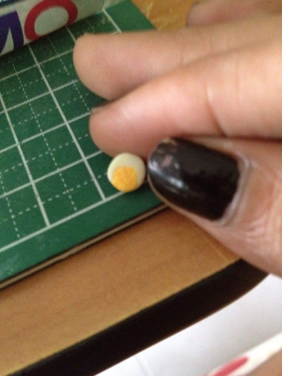 Turn over to the yolk-exposed side and by using a needle tool, outline the yolk and 'scratch' it to form its texture as shown. Ta da~ Use it to decorate tiny dishes or place in small jars :D