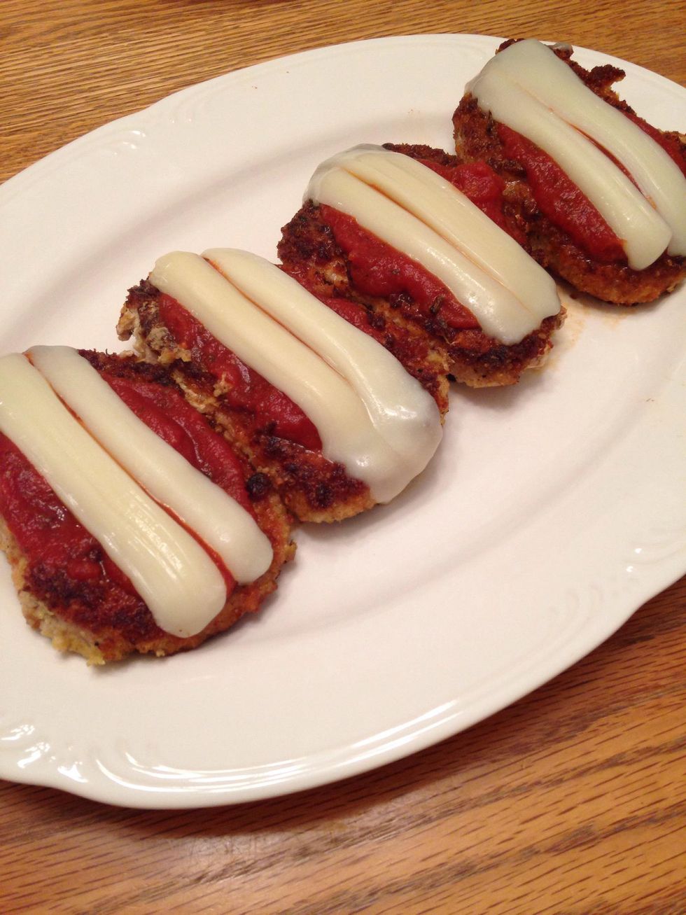 When pork is no longer pink on inside, remove from heat. Add some spaghetti sauce to the top of each pork loin.