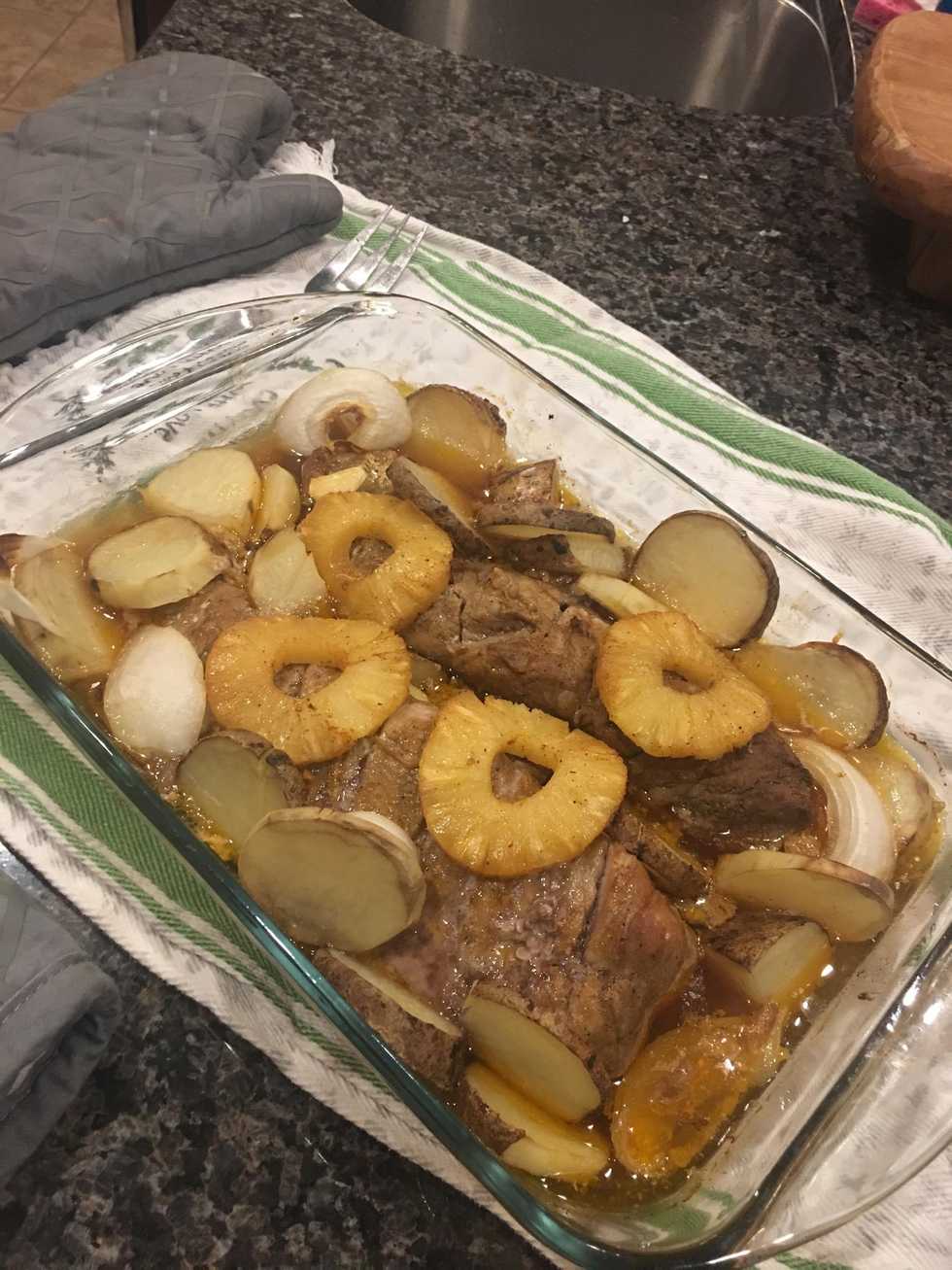 1/4c Worcestershire sauce1/4c Olive oil1/4c Pineapple Juice Pineapple slices 1/2 Onion1.0 Clove of Garlic Salt Pepper Paprika