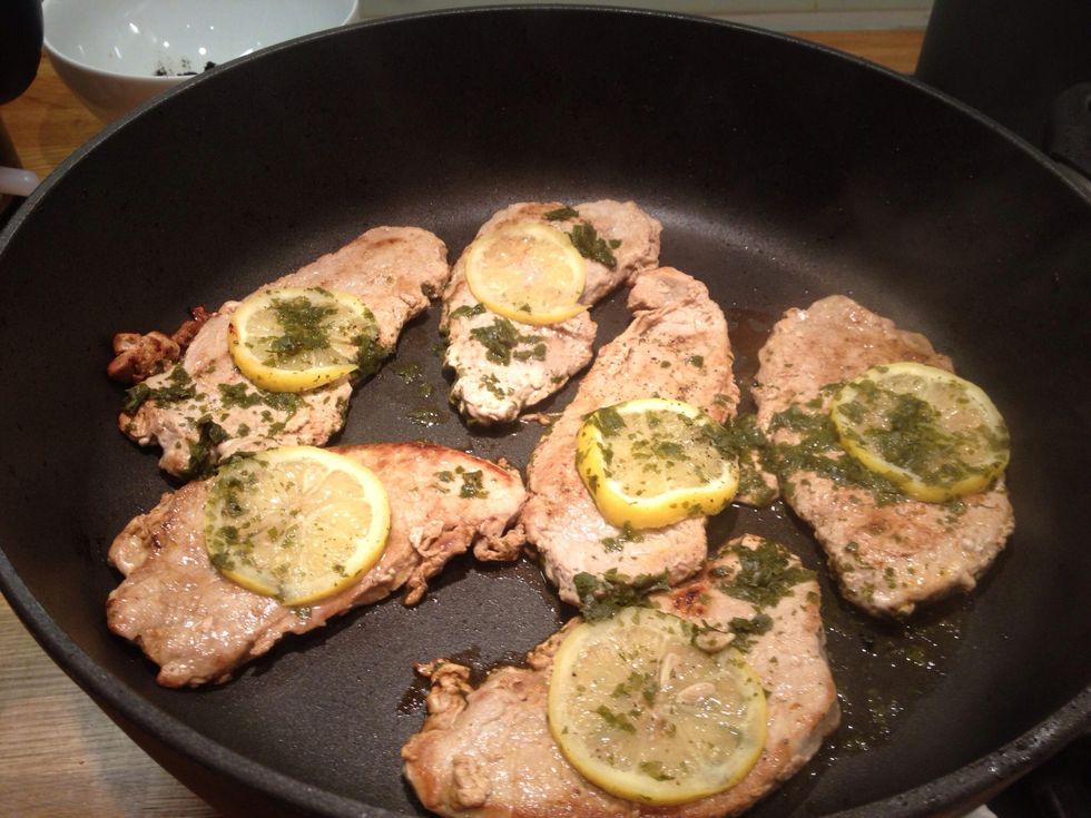 Take some pork loin steaks and using your fist or a meat hammer bash them until very thin (ideally thinner than this). You can dust them in seasoned flour before but I didn't to avoid the flour.