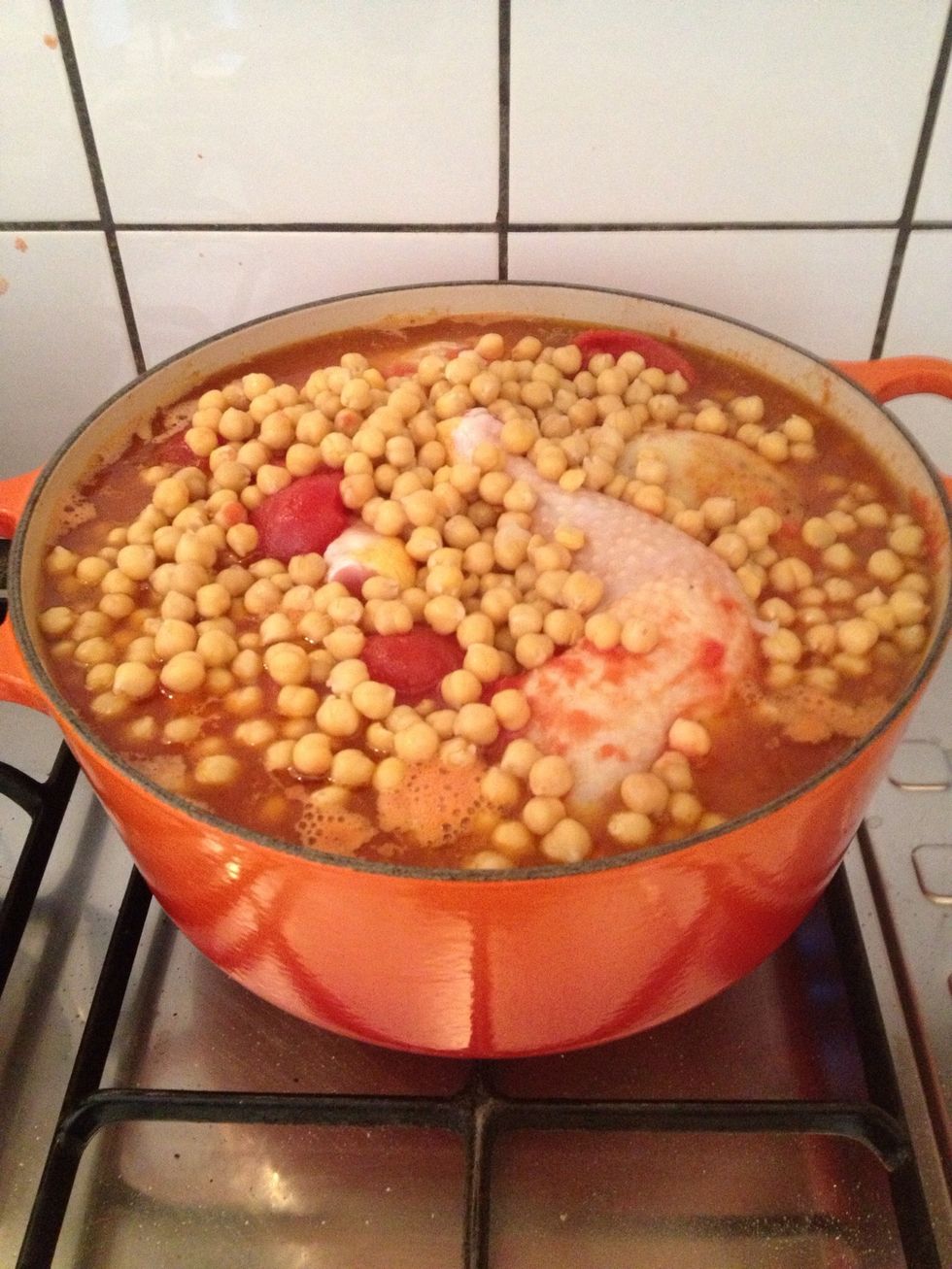 Add peeled tomatoes, chicken, chicken stock and chickpeas. Let it simmer on low heat for 1-2 hours. The longer the better!