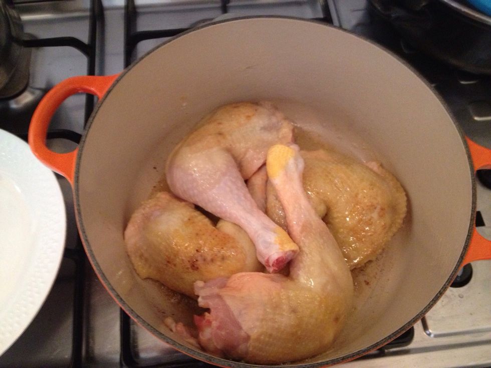 Lightly braise the chicken legs in olive oil or butter on medium heat