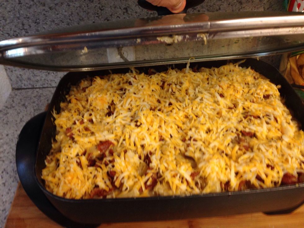 Mix ranch sauce into meat in baking dish or electric skillet as pictured. Cover with bacon and then cheese and simmer for 20-30 minutes.
